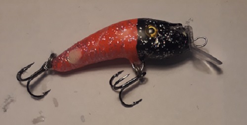 Vaapussa on punainen perä ja musta etuosa. Takana itsevalaisevasta teipistä täplä.