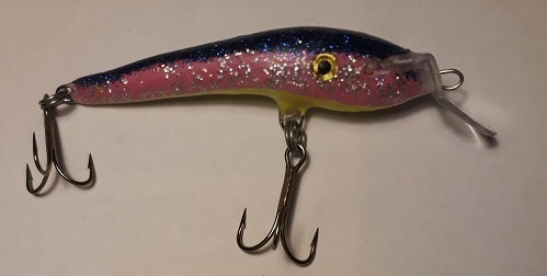 Vaapussa on sininen hile selkä, salmon pinkki kyljet hologrammi hopeahileellä.